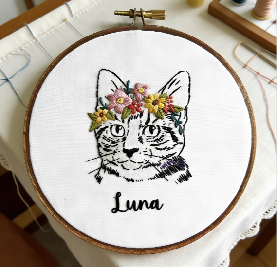Every whisker twitch, every quiet purr, every warm nuzzle against your palm — these are the moments that make your bond with your cat irreplaceable. Now you can turn those fleeting memories into something tangible and everlasting. Our hand-embroidered cat portraits capture not just your cat’s likeness, but the soulful warmth and unconditional love they bring into your life. Each stitch is woven with care, preserving the love you share so you can hold it close forever.